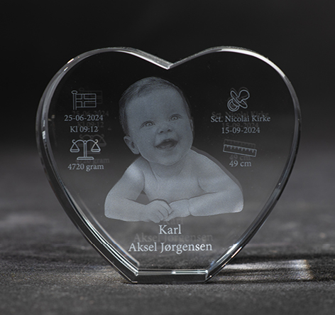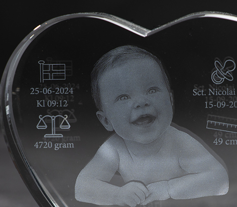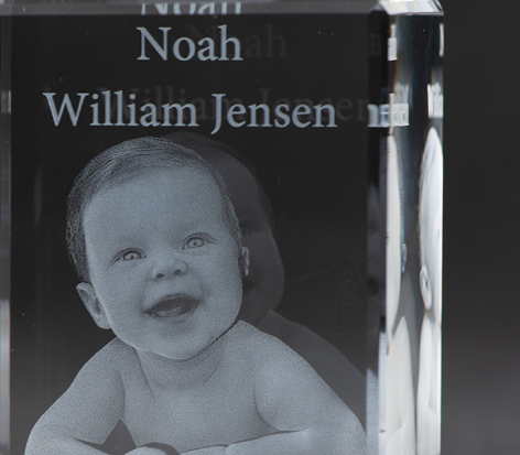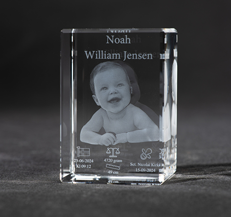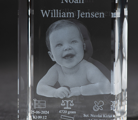 Vi tilbyder unikke og personlige dåbsgaver i form af 3D glas, hvor vi kan indgraverer dit billede og personlige oplysninger fra dåbsdagen og fødslen. Et personligt minde fra dåben til alle forældre og bedsteforældre.